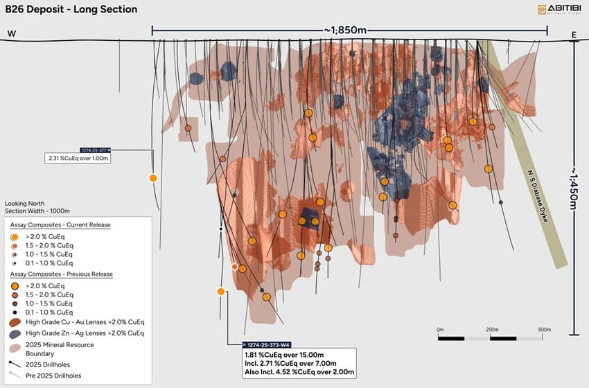 Abitibi Metals Corp. is pleased to report strong expansional results from its drill program at the B26 Polymetallic Deposit (“B26” or the “Deposit“) in Québec, in JV with SOQUEM Inc. The Company’s expansion and infill drilling programs are actively underway, targeting further definition and growth of the high-grade mineralization. Regional drilling has also commenced successfully, with additional results expected on an ongoing basis once available. These final results from Phase 3 and the initial hole from Phase 4 continue to demonstrate strong growth potential.