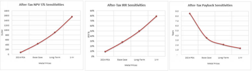 - Exceptional Leverage to upside metal prices: Assessed at the 1-year analyst consensus forecast for gold and silver prices (US$66.90/oz Ag and US$4,554/oz Au), the Project delivers US$1.55B after-tax NPV5%, a 79% IRR, and a 1.4-year payback; and