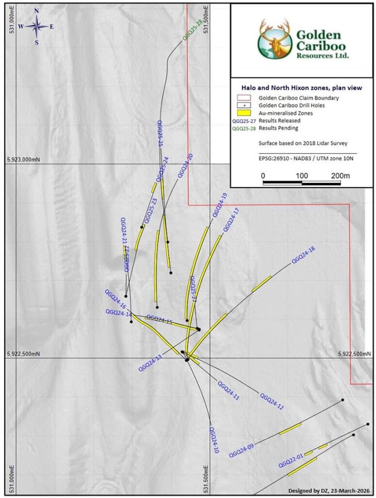 Golden Cariboo Resources Ltd. announces that drill hole QGQ25-28 was completed on March 19, 2026 to a total length of 754.69 m (2,476 ft), ending in mineralization approximately 12 m (39.37 ft) from Osisko Development Corp.’s claim boundary. The work was carried out at the Company’s Quesnelle Gold Quartz Mine Property (the “Property”), located approximately 4 kilometers northeast of Hixon and 50 kilometers southeast of Prince George, British Columbia.