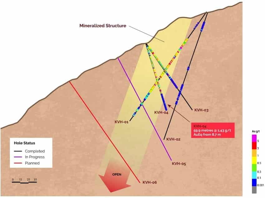 “Importantly, KVH-04 confirms continuity down-dip from KVH-03 and highlights the presence of multiple mineralized zones within a wider envelope. The system is interpreted to be structurally complex, with multiple fault sets influencing the distribution of veining and grade. As is typical of epithermal systems, this results in variability in mineralization within a broader envelope, with higher-grade zones developing in structurally favourable positions. Ongoing drilling, particularly KVH-05 and KVH-06, is critical to refining our understanding of this structural framework and improving targeting of higher-grade shoots at depth and along strike.”