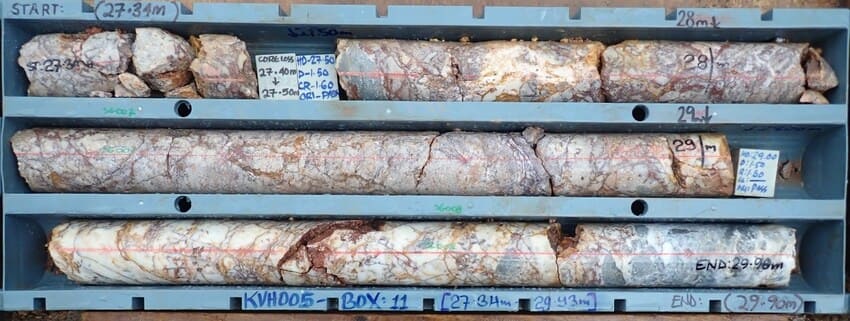 Geological logging of KVH-05 has identified well-developed multi-phase quartz-carbonate veining from near-surface, associated with hydrothermal brecciation, silica flooding and strong structural disruption. Veining occurs as crack-seal textures, stockwork zones and overprinting events, indicating multiple phases of fluid flow within a structurally controlled system. Sulphide mineralization (pyrite ± minor chalcopyrite) is observed along vein margins, within breccia matrices and in late-stage vein phases.