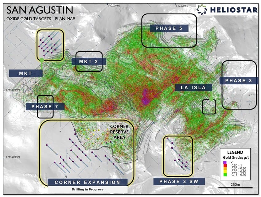 Heliostar has completed 75 holes and 7,230 metres to date in the current program that is testing eight near mine target areas. Today’s release covers 53 holes totalling 5,148 metres from three of the eight target areas, namely the Corner Expansion, Phase 3 SW and MKT Zones (Figure 1). Results demonstrate the potential for production growth and mine life extension at San Agustin. Intercepts at the Corner Expansion Zone show mineralization over 200 metres southwest of the edge of the current reserve that remains open. Drilling at the Phase 3 SW Zone has shown that mineralized corridors extend beyond the current pit and warrant follow-up drilling and the MKT Zone has returned widespread low-grade intervals.