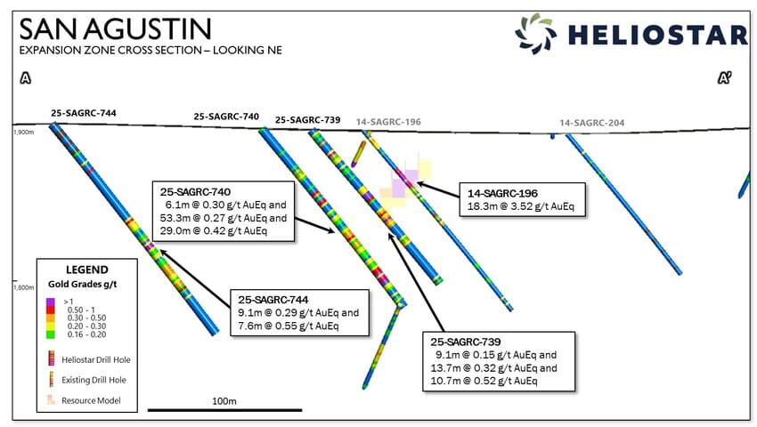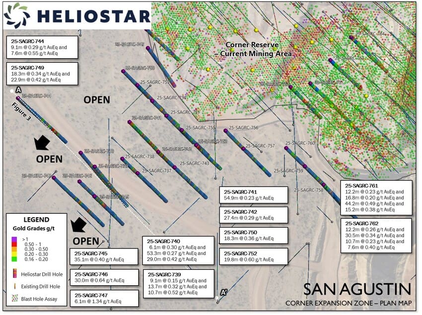 Heliostar Metals Ltd. announce the Company’s first results from drilling at its 100% owned San Agustin Mine in Durango, Mexico. For 2026, Heliostar has committed to a US$9.75M resource and reserve drilling program which has been increased from 10,000-15,000 metres to 15,000-18,000 metres of drilling. The program has a primary aim of finding additional oxide resource ounces to support an extension of the mine life.