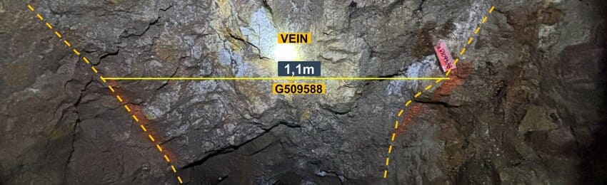 | 21.0 g/t | 156 g/t | 1.0 metre | 435336E/603379N | (6) 2025 |