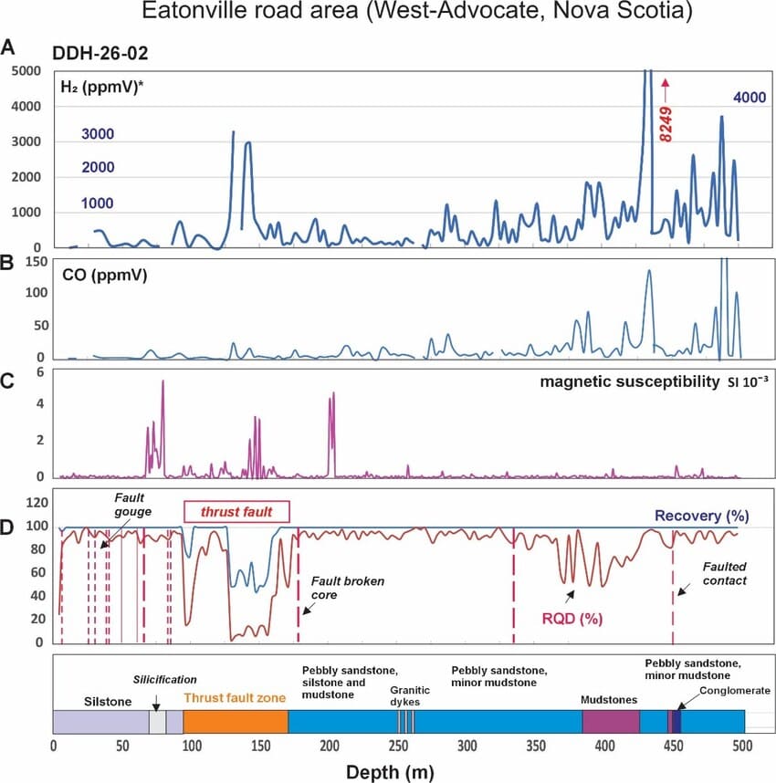 Below Zone I, headspace hydrogen concentrations remain low until the appearance of a sandstone with minor mudstone package intruded by many thin granitic dykes, marking the end of a relatively low-permeability interval. At greater depth, the stratigraphy becomes dominated by pebbly sandstones with minor mudstone interbeds (Fig. 1d). This coarser, more brittle succession hosts several H₂ peaks exceeding 1,000 ppmV. The highest concentrations in DDH-26-02 occur within Zone II, pebbly sandstone (8,249 ppmV), and more precisely at the end of a zone of fractured rocks as shown by the RQD data. These coarse sedimentary units directly overlie a 6.5 m mudstone bed, which is interpreted as a permeability barrier, restricting lateral flow and concentrating hydrogen within the underlying more permeable fractured conglomeratic sandstones.