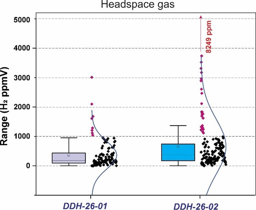 The headspace gas results quantify the hydrogen detected in borehole water samples collected at regular intervals throughout the drill program. The data show not only the peak concentration achieved, but also how frequently high readings occurred across the full length of the hole — both of which are relevant indicators of the extent and intensity of hydrogen circulation.