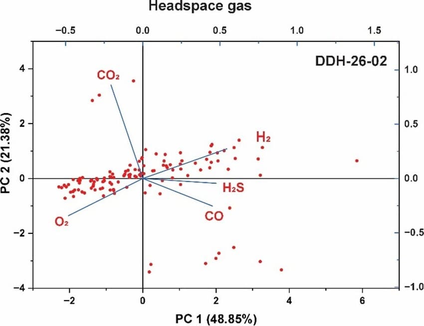 Beyond measuring hydrogen concentrations, the full suite of gases detected in DDH-26-02 provides independent evidence about the chemical environment at depth. The pattern of gases observed is consistent with strongly reducing conditions — the geochemical signature expected where hydrogen is being generated through water-rock interaction. This multi-gas fingerprint adds a layer of scientific corroboration to the hydrogen readings themselves.
